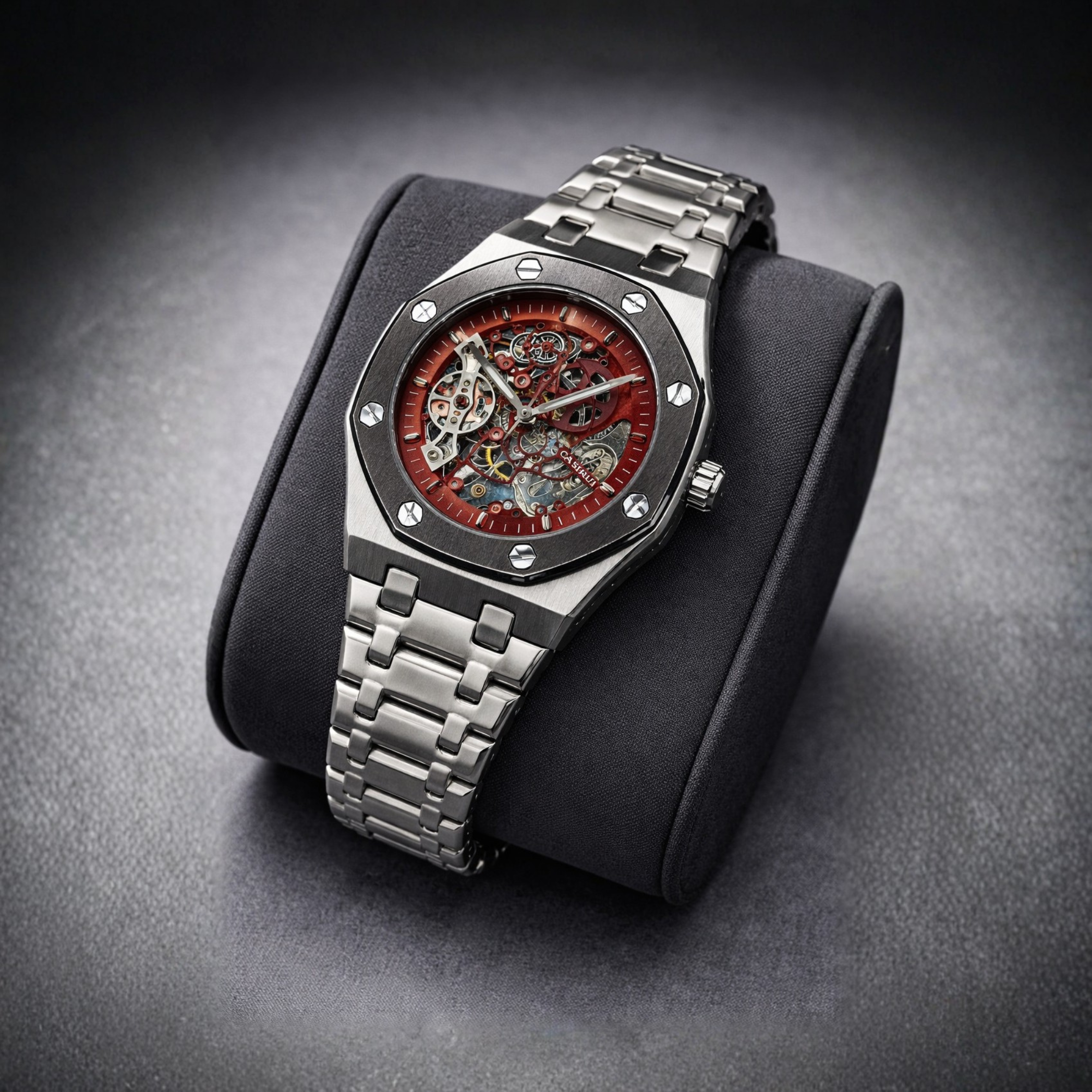 Home Watches Luxury Watches CHAIN AUTO LUXURY MACHENICAL WATCH WITH SKELETON BACK (RED DIAL)